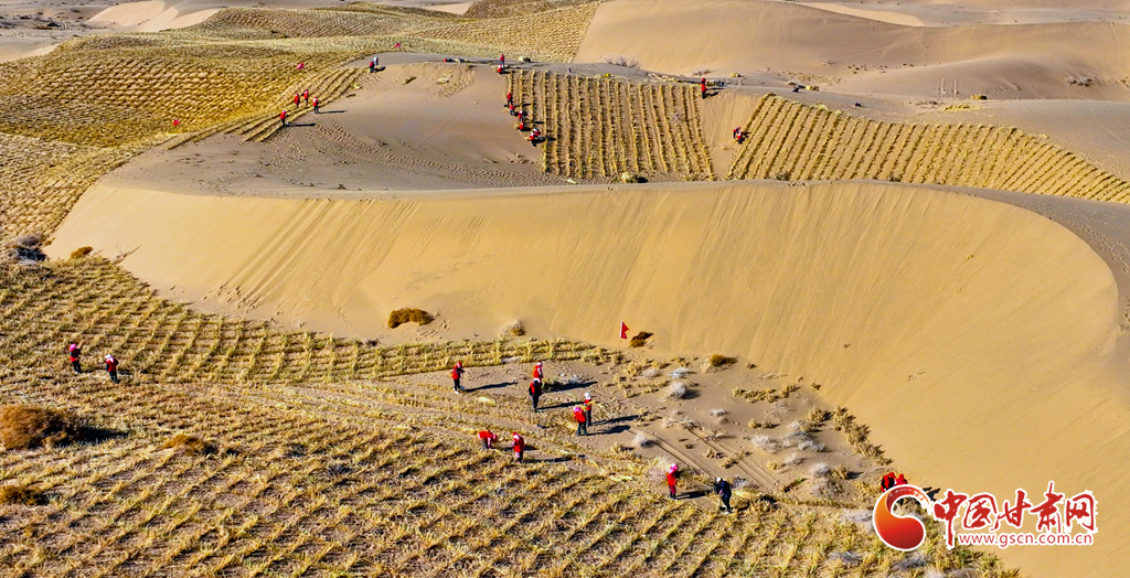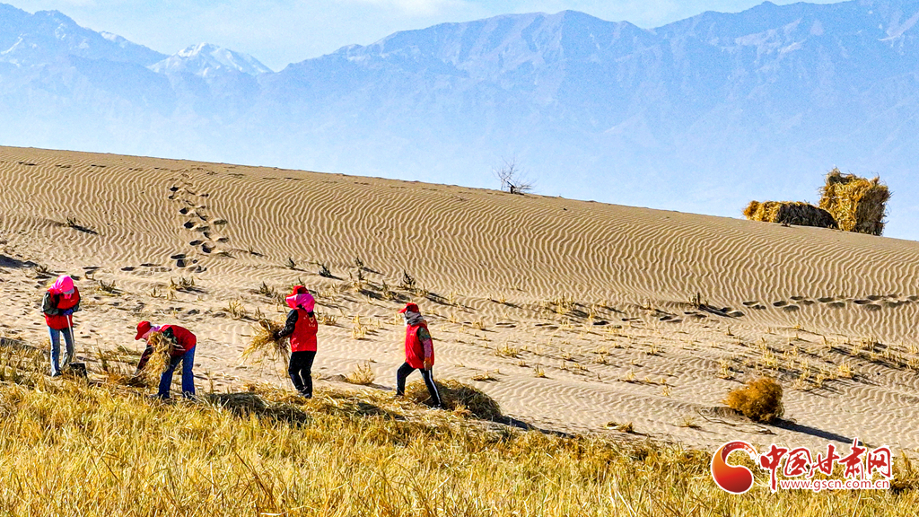 連日來,在張掖市肅南裕固族自治縣明花鄉(xiāng)西南部的干旱荒漠區(qū),運(yùn)草車輛往復(fù)穿梭,1600余名治沙工人于巴丹吉林沙漠西南緣的沙丘間忙碌作業(yè)。他們劃線、背草、俯身鋪草、揮鍬壓埋,全力營(yíng)建沙障與固沙林帶,為沙漠牢牢“鎖邊”。