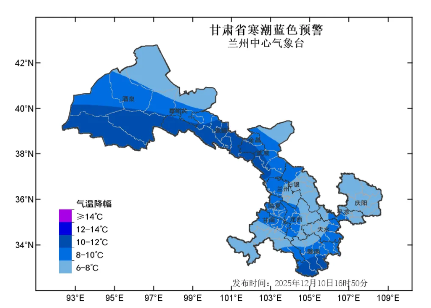 蘭州中心氣象臺2025年12月10日16時50分發(fā)布寒潮藍(lán)色預(yù)警:預(yù)計(jì)11日至13日清晨,全省大部自西向東最低氣溫下降6-8℃,其中河西五市、隴南等部分地方及隴中局部地方下降8~10℃,局地可達(dá)10℃以上,上述部分地方將出現(xiàn)寒潮。河西五市降溫時段為11日白天至12日白天,省內(nèi)其余地方降溫時段為11日夜間至13日清晨。請注意防范!