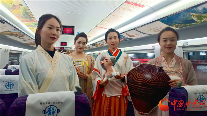 這趟列車,是敦煌研究院、甘肅省博物館、甘肅簡(jiǎn)牘博物館、蘭州市博物館、天水市博物館、武威市博物館、平?jīng)鍪胁┪镳^、臨夏州彩陶館(州博物館)、和政古動(dòng)物化石博物館九家國家一級(jí)博物館聯(lián)袂打造的“高鐵流動(dòng)博物館”。