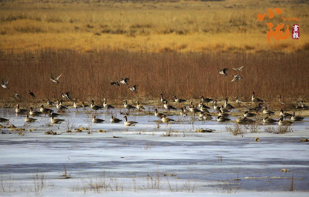 冬日濕地,鳥類或靜立冰面,或翩然飛越金黃蘆葦。每年候鳥遷飛之季,赤麻鴨等國家重點(diǎn)保護(hù)鳥類在此棲身,鳥鳴與葦浪聲交織回蕩,宛如自然寫就的生態(tài)詩篇。