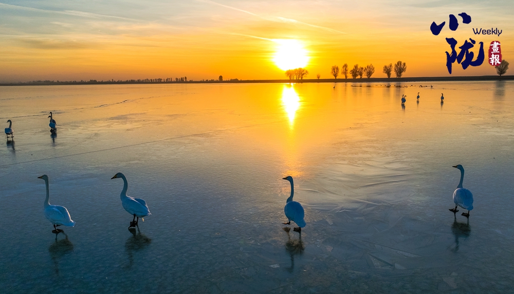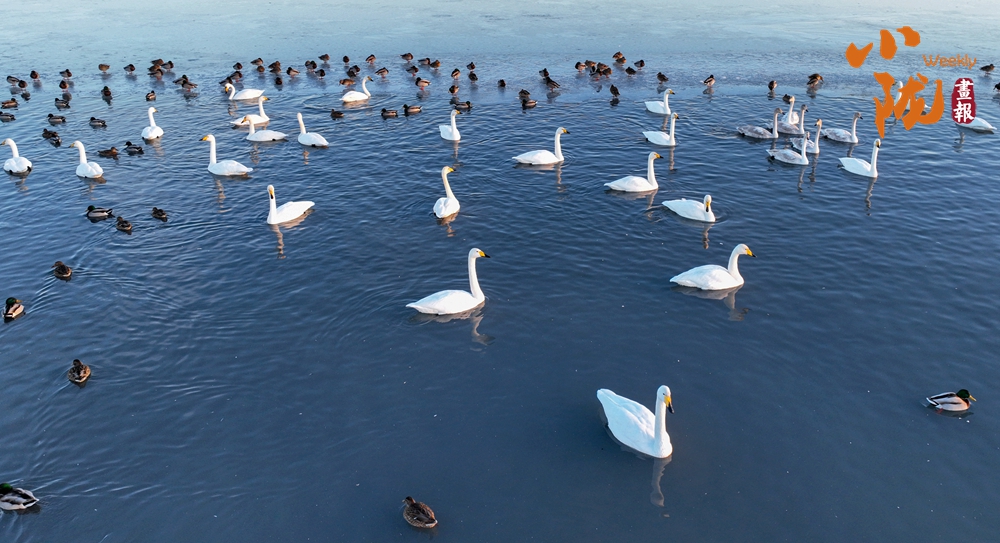 陽(yáng)光斜照,萬(wàn)物生暖。水面上,成群的白天鵝不緊不慢地游著,雪白的身影倒映水中,隨著微波輕輕蕩漾,像是一幅流動(dòng)的水墨畫(huà),素雅而安寧。